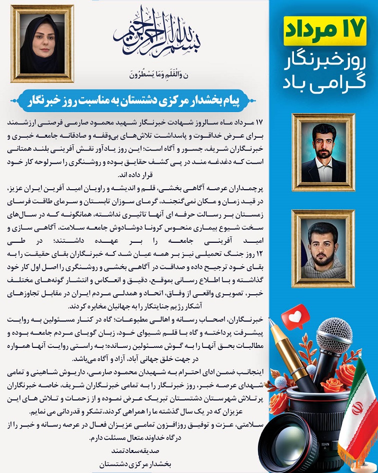 اینجانب ضمن ادای احترام به شهیدان محمود صارمی، داریوش شاهینی و تمامی شهدای عرصه خبر، روز خبرنگار را به تمامی خبرنگاران شریف، خاصه خبرنگاران پرتلاش شهرستان دشتستان تبریک و تهنیت عرض نموده و از زحمات و تلاش های این عزیزان که در یک سال گذشته ما را همراهی کردند، تشکر و قدردانی می نمایم.